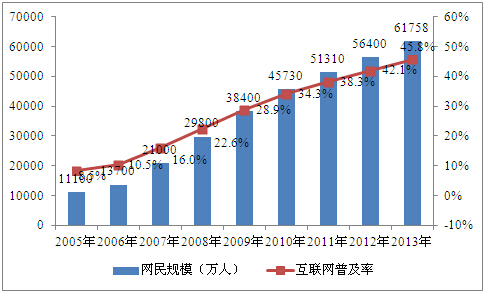 图表 7:2005-2013年我国网民规模和互联网普及率