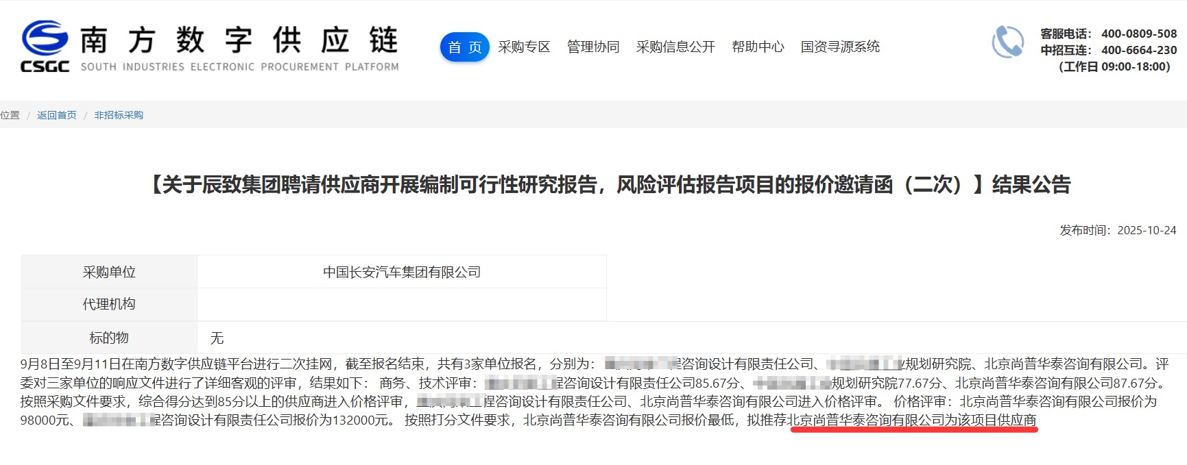 2025-11-26 10:58:30 尚普华泰中标《关于辰致集团聘请供应商开展编制可行性研究报告,风险评估报告项目》2025年9月,尚普华泰参与中国长安汽车集团有限公司采购的《关于辰致集团聘请供应商开展编制可行性研究报告,风险评估报告项目的报价邀请》。